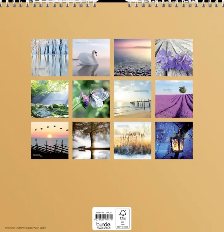 12 Kuvaa. Kauniit Ja Harmoniset Kuvat Yhdessä Mietelauseiden Kanssa. Kalenteri Sisältää Nimipäivät, Juhlapyhät Ja Liputuspäivät. Suomenkielinen. Parikierresidottu. Fsc®. Koko: 300X600 Mm (Avattuna).