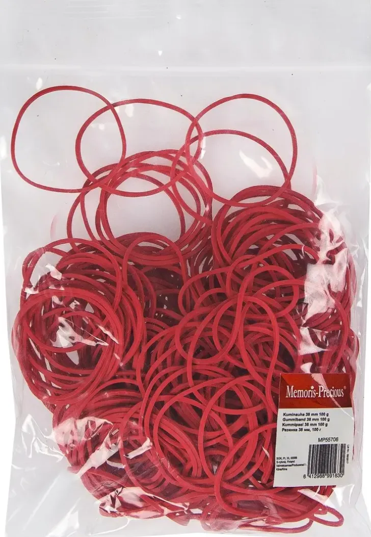 Kuminauhapakkaus, Jossa 100 G Punaisia Kuminauhoja. Kuminauhan Koko: 38 Mm.