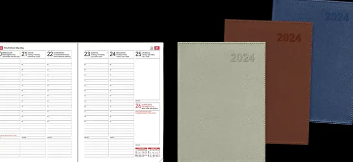 Ommeltu A5-Kokoinen Kalenteri. Hienostonut Keinonahkakansi, 3 Eri Väriä. Viikot 49/2023-1/2025, Vuosisuunnittelu 2024 Ja Vuosi 2025 Laajennettuna. Viikko Aukeamalla, Tunnit 8-20. Liputuspäivät, Kansalliset Pyhät Aukeamilla Ja Luettelona, Nimipäivät, Tehtäväruudukko, Tehtäväluettelo, Vuosikalenterit 2025-2028. Lukunauha. Kielisyys Suomi, Ruotsi Ja Englanti.