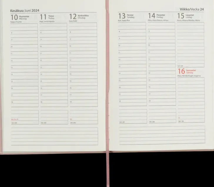 Vuosikalenteri Kangaskansilla Ja Kirjanmerkkinauhalla. Koko: A5. Kielisyys: Suomi, Ruotsi. 192 Sivua.