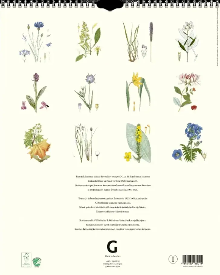 Art Collection-Seinäkalenteri Vuodelle 2024. Erittäin Tukevaa 250 Gramman Luonnonvalkoista Fsc Kartonkia. Suomenkielinen, Suomalaisilla Nimipäivillä. Koko: 328 X 405 Mm. Kalenterilla On Joutsenmerkki. Tämän Kalenterin Kauniit Kuvitukset Ovat Prof. C. A. M. Lindmanin Suuresta Teoksesta Bilder Ur Nordens Flora (Pohjolan Kasvit). Lindman Toimi Professorina Luonnontieteellisessä Kansallismuseossa Ruotsissa Ja Ensimmäinen Painos Ilmestyi Vuosina 1901-1905. Toinen Ja Kolmas Laajennettu Painos Ilmestyivät 1922-1926 Ja Painettiin A. Börtzellsin Toimesta Tukholmassa. Nämä Painokset Käsittävät 635 Sivua Tekstiä Ja 663 Värillistä Julistetta. Kirjat On Julkaistu Viidessä Osassa. Tämän Kalenterin Kuvat Ovat Laajennetusta Painoksesta. Kasvien Latinankieliset Nimet Ovat Voineet Muuttua Vuosikymmenten Kuluessa.