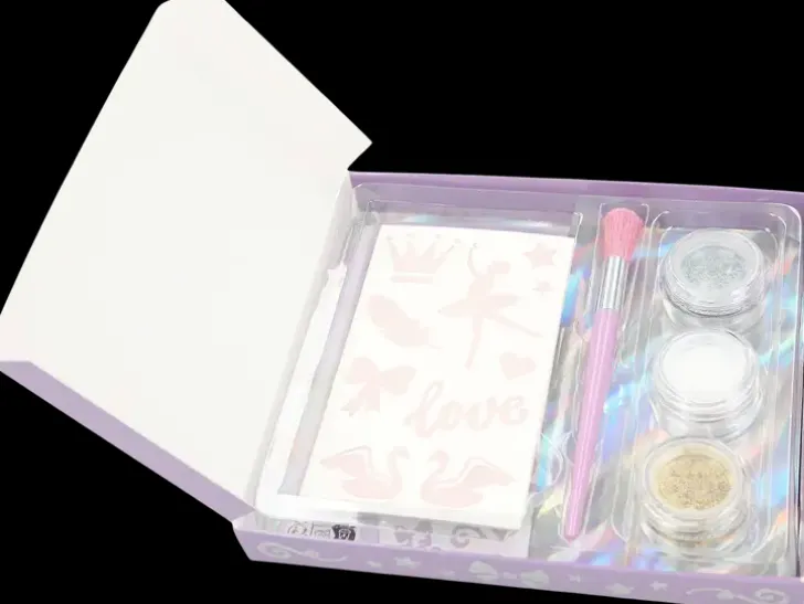 Upea Kimalletatuointisetti, Jossa Mukana Pohjat Erilaisiin Tatuointeihin, Pensseli Sekä Valkoinen, Hopeinen Ja Kultainen Kimallejauhe. Näillä Luot Ihollesi Kimaltelevan Säihkyvät Katseenvangitsijat!