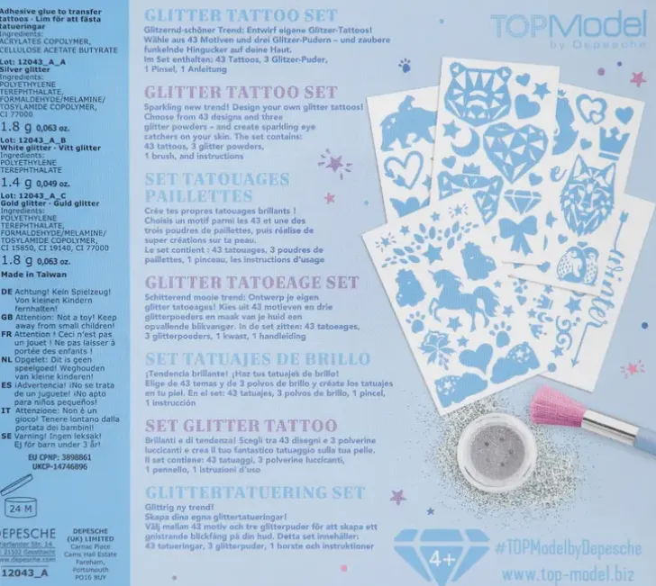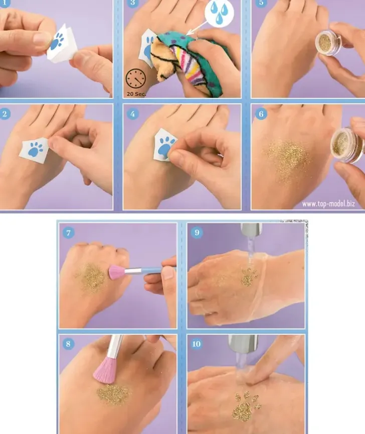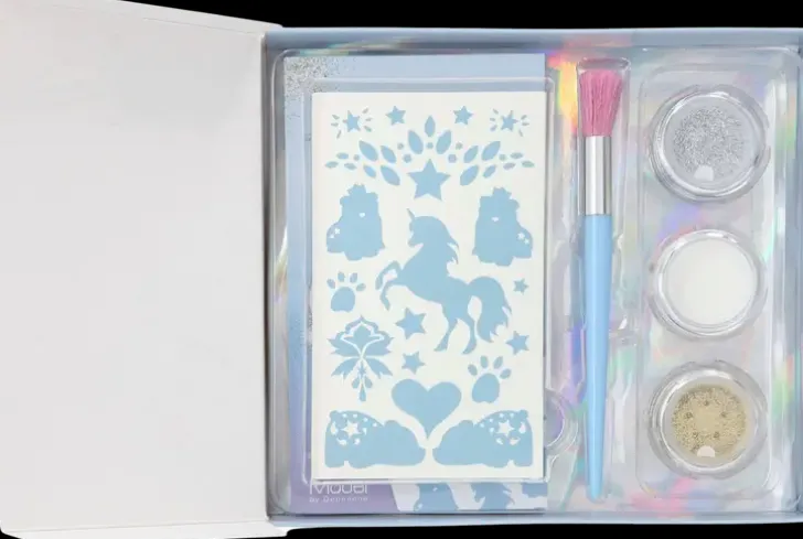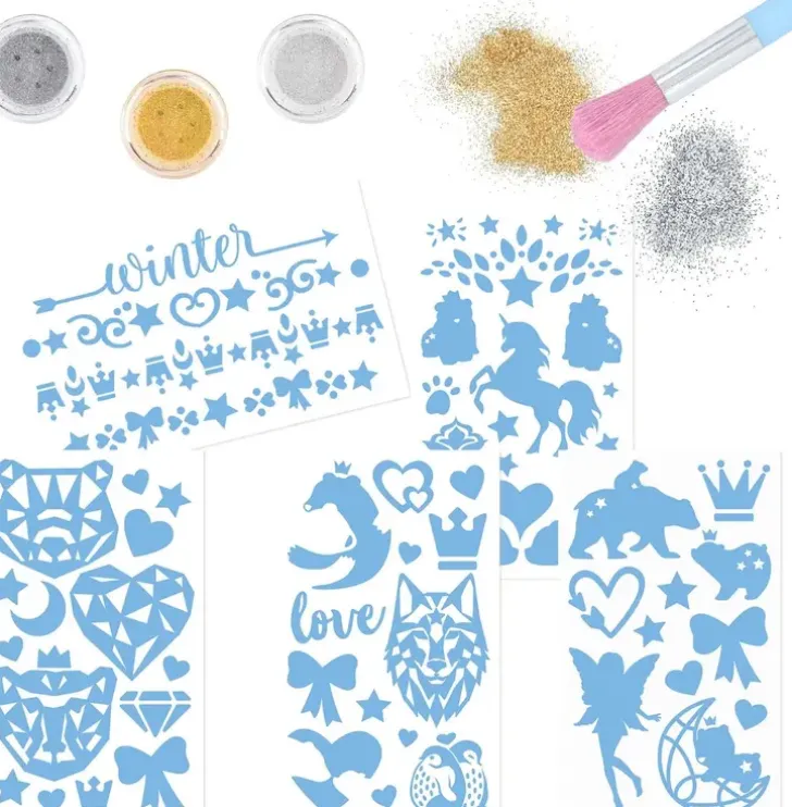 Upea Kimalletatuointisetti, Jossa Mukana Pohjat Erilaisiin Tatuointeihin, Pensseli Sekä Valkoinen, Hopeinen Ja Kultainen Kimallejauhe. Näillä Luot Ihollesi Kimaltelevan Säihkyvät Katseenvangitsijat!