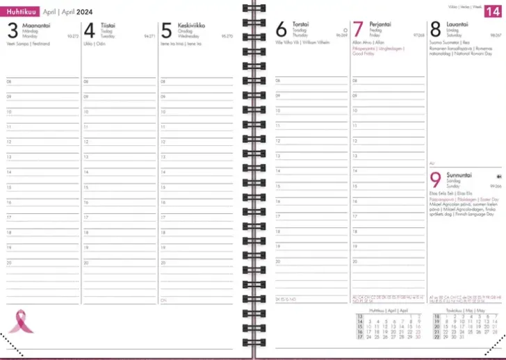 Tue Roosanauha -Kampanjaa Hankkimalla Upea, Jo Klassikoksi Muodostunut Kalenteri Vuodelle 2024! Myyntituotosta Lahjoitetaan 10% Osuus Syöpäsäätiölle Erilaisten Syöpien Vastaiseen Työhön Ja Tutkimukseen. A5 Kokoinen Parikierresidottu Malli Viikkoaukeamalla Ja Kuvioiduilla Keinonahkakansilla. Kolmikielinen Sisältö: Suomi, Ruotsi Ja Englanti. Kalenteri Alkaa Viikosta 49/2023 Ja Päättyy Viikkoon 1/2025. Kalenterissa On Monia Hyödyllisiä Ominaisuuksia, Kuten Taittuva Etukansi, Viikkoaukeama, Yhteystietokortti Ja Vuosikatsaus. Kalenteriosuudessa Mukana Liputus- Ja Juhlapäivät, Vuosisuunnittelu-Osio, Suomen Ja Ruotsinkieliset Nimipäivät, Kansainväliset Vapaapäivät, Ja Uutena Syntymäpäivä- Ja -Lahjasivut. Reilusti Viivoitettua Muistiinpanotilaa. Takakannessa Kaksinkertainen Muovitasku Lipuille Ja Kuiteille. Sisäsivuilla Roosa Nauha -Logo Jokaisella Aukeamalla. Valmistettu Fsc-Sertifioidusta Paperista.