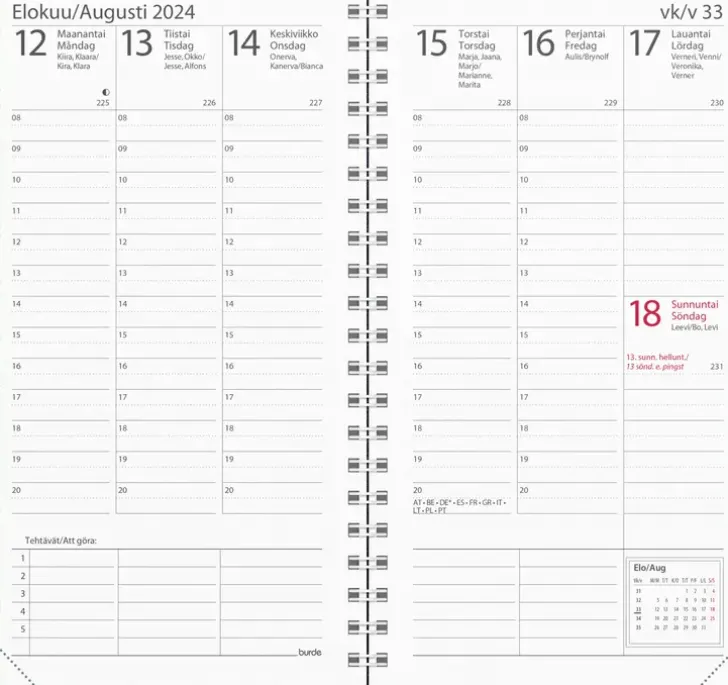Kalenterin Aukeamalla Yksi Viikko Ja Kuluvan Kuukauden Kalenteritaulukko, Tuntijaotus 08-20. Kalenteri Sisältää Nimipäivät, Kansalliset Pyhäpäivät, Liputuspäivät, Kuun Vaiheet, Vuosisuunnitelmat Kuluvalle Ja Seuraavalle Vuodelle, Vuosiruudukot Kuluvalle Ja Seuraavalle Vuodelle, Yleiset Pyhäpäivät Euroopassa, Kalendaariset Tiedot, Suomen Kartta, Välimatkataulukon Ja Erillisen Puhelinmuistion. Kalenteriosa: Vk 52 2023-Vk 1 2025. Kaksikielinen: Suomi/Ruotsi. Parikierresidottu. Koko 83X158 Mm.