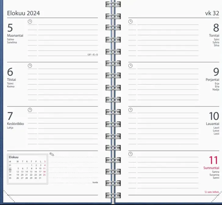 Pellavatekstiilikansi. Kalenterin Aukeamalla Yksi Viikko Ja Kuluvan Kuukauden Kalenteritaulukko. Kalenteri Sisältää Nimipäivät, Kansalliset Pyhäpäivät, Liputuspäivät, Kuun Vaiheet, Vuosisuunnitelmat Kuluvalle Ja Seuraavalle Vuodelle, Yleiset Pyhäpäivät Euroopassa, Kalendaariset Tiedot, Suomen Kartta, Välimatkataulukon Ja Puhelinmuistion. Kalenteriosa: Vk 51 2023-Vk 1 2025. Suomenkielinen. Parikierresidottu. Koko: 83X158 Mm.