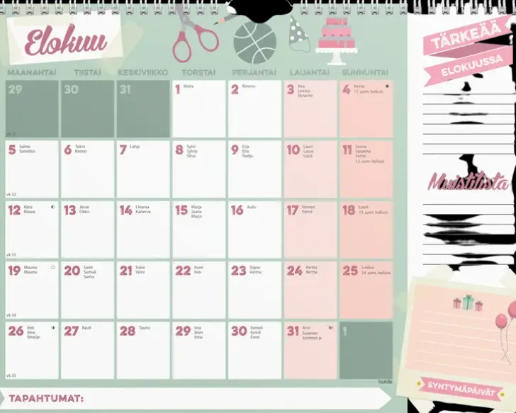Burde Perhekalenteri 2024 Perheen Kuukausikalenteri