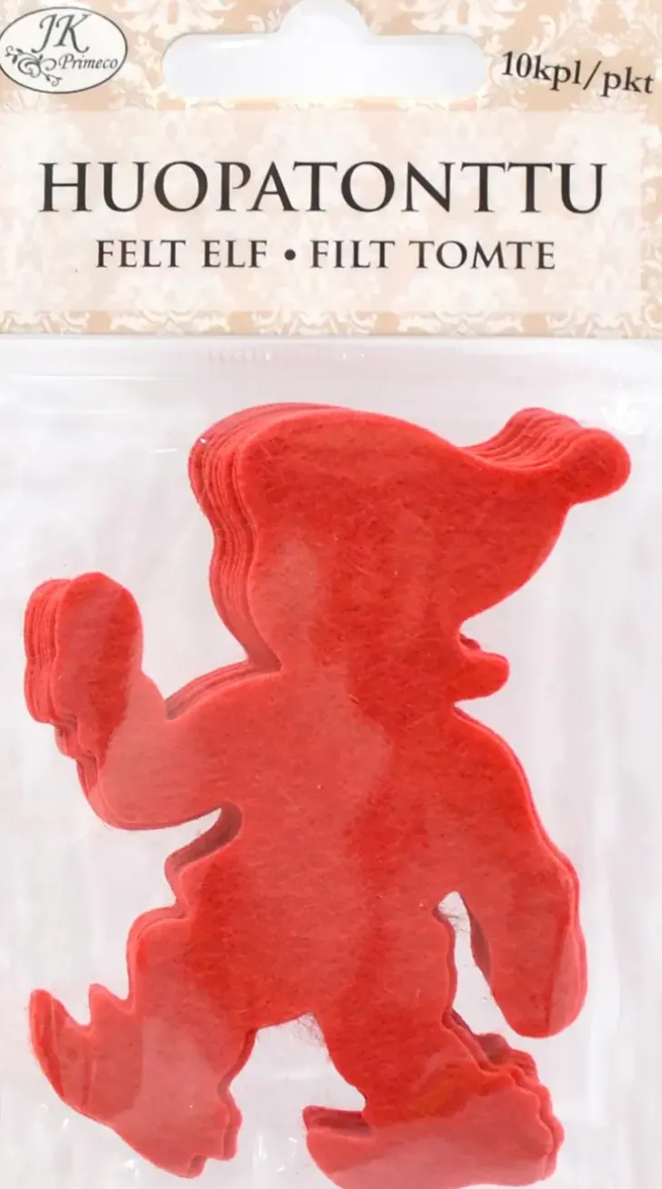 Huopatontut Askarteluun Ja Koristeluun. Pakkaus Sisältää 10 Kappaletta Huovasta Valmistettuja Tonttuja. Yhden Tontun Koko On N. 7,5Cm X 5Cm.
