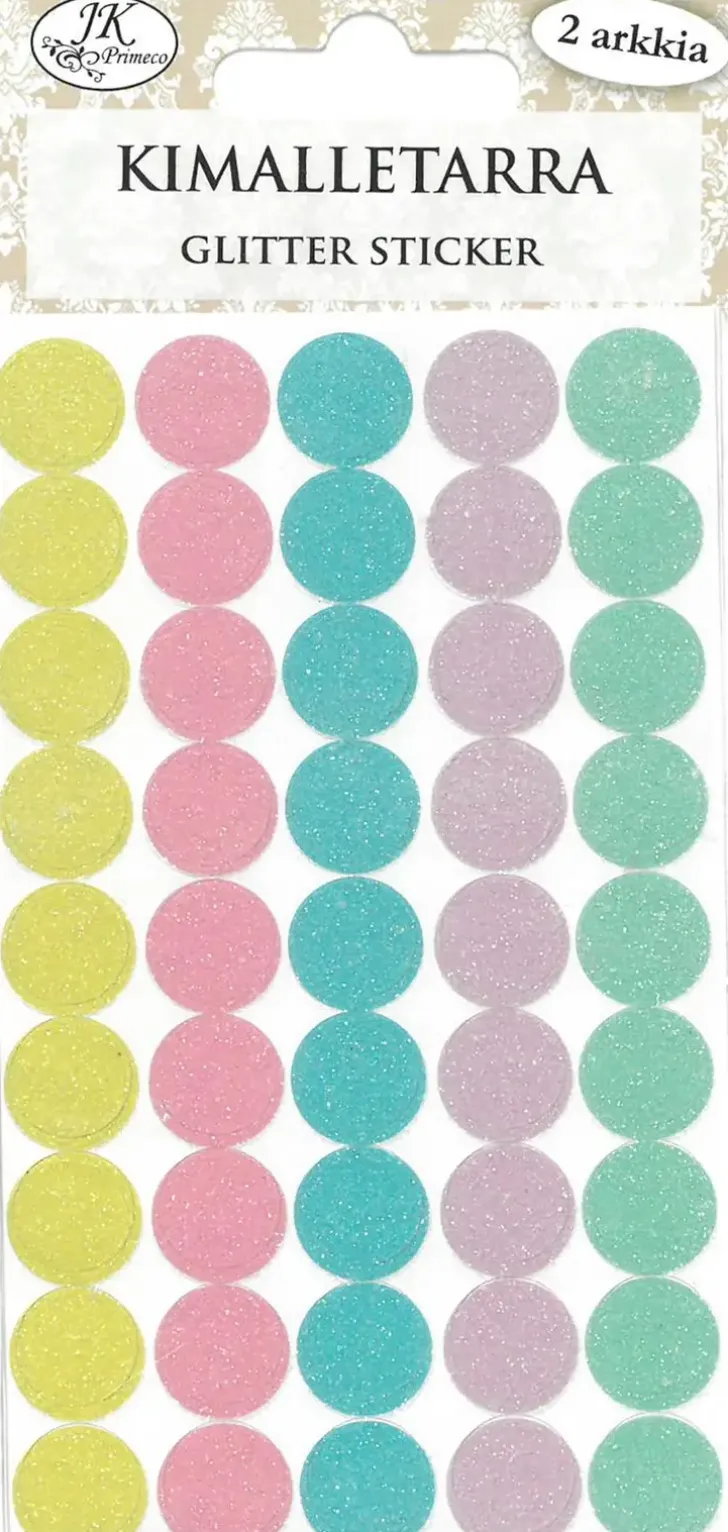 Kimalletpallotarrat Askarteluun Ja Koristeluun. Pakkaus Sisältää Kaksi Arkkia Pallon Muotoisia Paperisia Kimalletarroja Viidessä Eri Värissä, Yhteensä 45 Tarraa. Yhden Tarran Halkaisija On N. 1,4Cm.