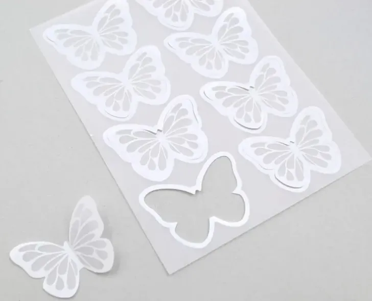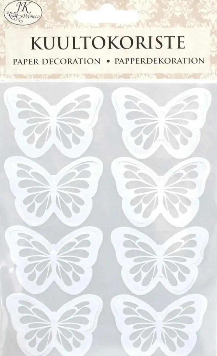 Kuultokoristeet Askarteluun Ja Koristeluun. Pakkaus Sisältää 8 Kappaletta Koristeperhosia, Jotka On Valmistettu Kuultopaperista. Yhden Perhosen Koko On N. 4 X 3Cm.