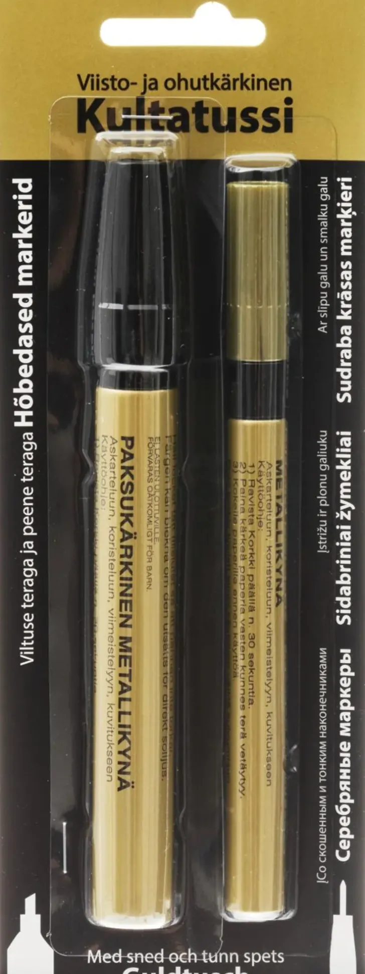 Pakkauksessa Sekä Ohut- Että Viistokärkinen Vedenpitävä Kultatussi. Kultatussi Käy Kaikenlaiseen Askarteluun Ja Koristeluun.