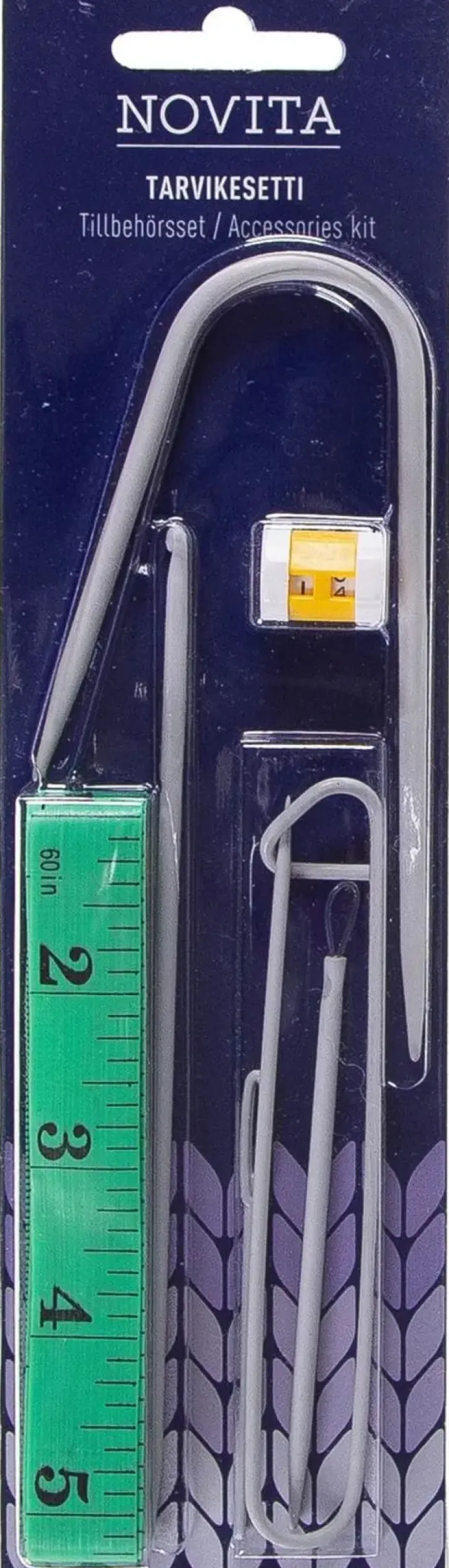 Neulojalle Ja Virkkaajalle Novitan Näppärä Tarvikesetti! Setti Sisältää 7 Tarpeellista Apuvälinettä: Mittanauhan, Viimeistelyneulan, Apuvälineen Langan Pujottamiseen Neulansilmään, Puikkokoukun, Silmukanpidikkeen, Kerroslaskimen Ja Apupuikon Esim. Palmikon Neulomiseen.