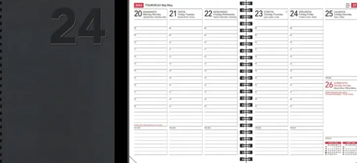 Sama Kalenteriosa Kuin Viikkomuistiossa, Mutta Tukevissa Kierrätyskartonkikansissa. A5-Kokoinen, Viikot 48/2023-1/2025, Vuosisuunnittelu 2024 Ja Vuosi 2025 Laajana, Aukeamalla Viikko, Tunnit 8-19. Yleiskalendaario, Liputuspäivät, Kansalliset Pyhät Aukeamilla Ja Luettelona, Nimipäivät Myös Luettelona. Infosivuja, Tehtäväruudukko, Tehtäväluettelot, Syntymäpäivä- Ja Lahjasivu Sekä Vuosikalenterit 2025-2028. Aukeamilla Kahden Kuukauden Seuranta. Runsaasti Päiväkohtaista Muistiinpanotilaa. Wiresidottu, Kulmaperforoitu. Mustat Kierrätyskartonkikannet, Pyöristetyt Kulmat. Kielisyys Suomi, Ruotsi Ja Englanti.