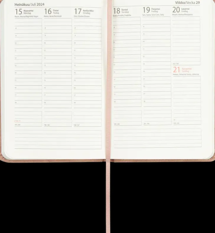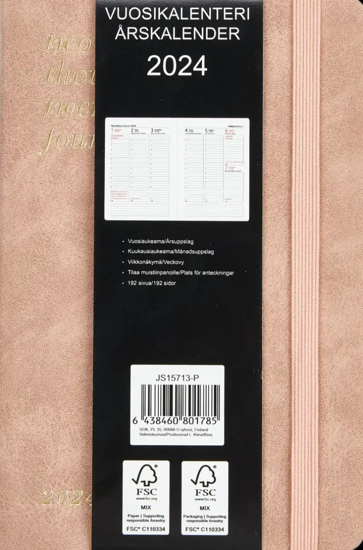 Taskukalenteri Kuminauhalla Ja Kirjanmerkkinauhalla. Koko: A6. Kielisyys: Suomi, Ruotsi. 192 Sivua.