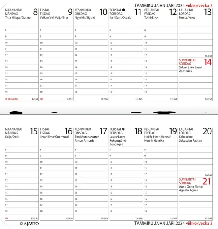 Kompakti Ajanhallinnan Mestari Kaksikielisenä. Koko 85 X 162 Mm; Leatherette-Kannet; Sidottu; Kielisyys: Suomi, Ruotsi; Kaksiviikkoinen Kalenteriaukeama Vaakana; Päiväkirja 48/2023–7/2025; Vuosisuunnitelmat 2024 Ja 2025; Liputuspäivät Suomessa; Kansalliset Vapaapäivät Päiväkirjan Sivuilla Ja Taulukkona; Suomalaiset Ja Suomenruotsalaiset Nimipäivät; Välimatkataulukko; Muistiinpanotilaa; Fsc®-Sertifioitu Tuote.