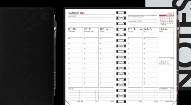 Sivukoko 87 X 153 Mm, Viikot 42/2023-1/2025, Kuukausi- Ja Projektisuunnittelusivut 2024 Ja 2025, Monikäyttöinen Viitelomakkeisto. Aukeamalla Viikko, Tunnit 8-18, Liputuspäivät, Kansalliset Pyhät Aukeamilla Ja Luettelona, Nimipäivät. Wiresidottu, Kulmaperforoitu. Huippulaadukas Keinonahkakansi On Aina Pehmustettu, Sisävuorattu Ja Reunaommeltu. Suomenkielinen. Keinonahkakansissa On Kalenterin Lisäksi Mukana Myös Siirrettävä Notes-Muistio. Kansia Voi Käyttää Useamman Vuoden Niiden Kestävän Rakenteen Ansiosta.
