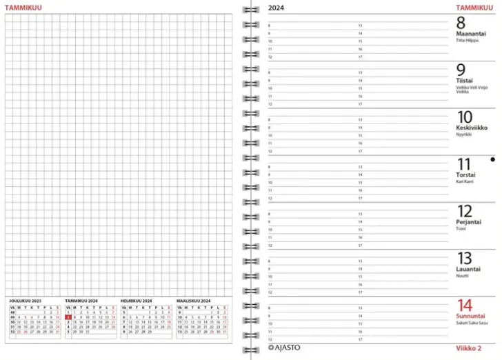Selkeälinjainen Arjen Kaveri, Joka Kestää Kovaakin Kulutusta. Koko 105 X 148 Mm; Parikierresidottu; Mustat Kolmiosaiset Kannet; Kannen Ikkunasta Helppo Seurata Kuluvaa Viikkoa; Päiväkirja 52/2023–2/2025; Vuosisuunnitelmat 2024 Ja 2025; Suomalaiset Nimipäivät; Irrotettava Puhelinlehti; Runsaasti Muistiinpanotilaa; Fsc®-Sertifioitu Tuote.
