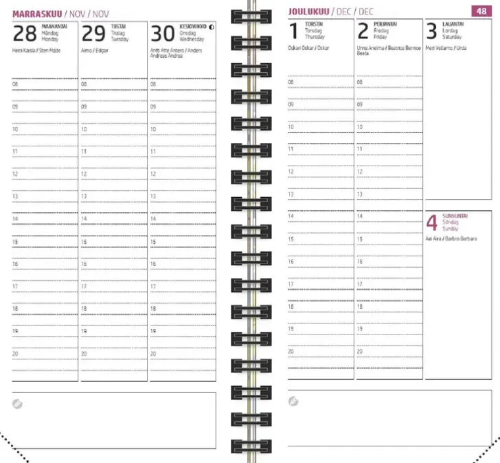 Upea Vallila Design-Taskukalenteri. Tässä Kartonkikantisessa Vuoden 2024 Kierresidotussa Kalenterissa On Kolmikielinen Viikkonäkymä 12 Kuukauden Sisällöllä, 48/2023-1/2025. Kielet Suomi, Ruotsi Ja Englanti. Suomalaiset Nimi- Ja Juhlapäivät. Sisältää Vuosisuunnitelman, Liputuspäivät, Suomenkieliset Nimipäivät Ja Runsaasti Viivoitettua Muistiinpanotilaa. Valmistettu Fsc-Sertifioidusta Paperista.